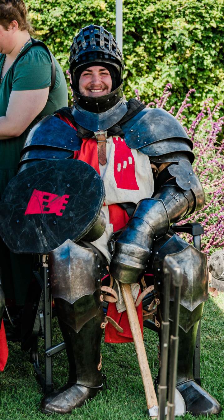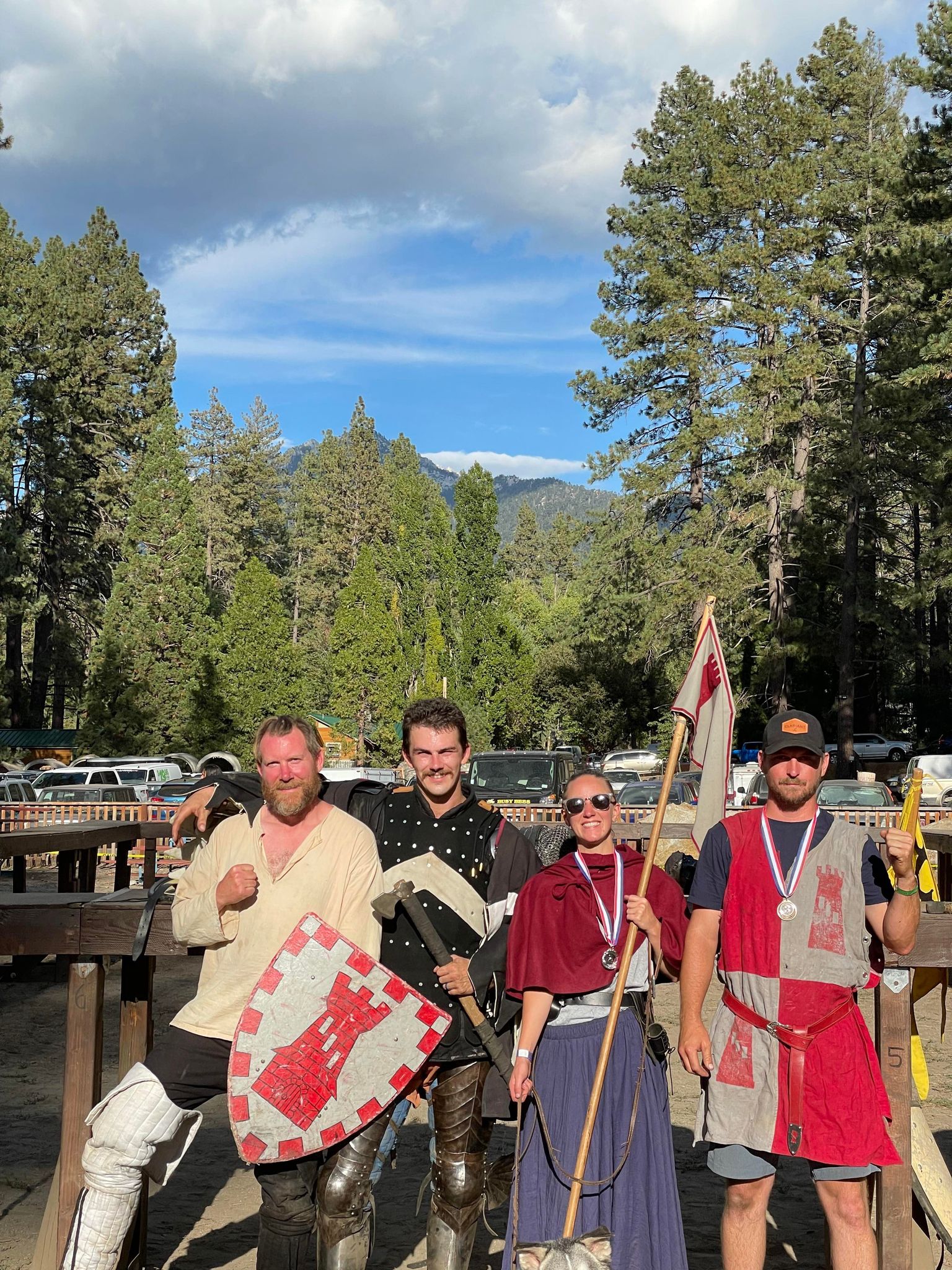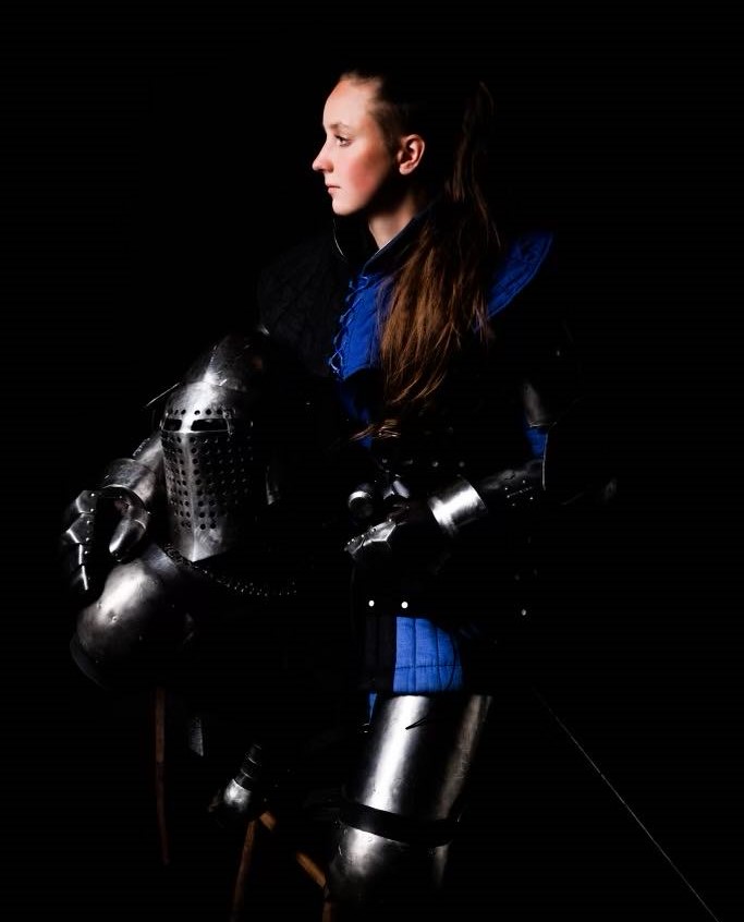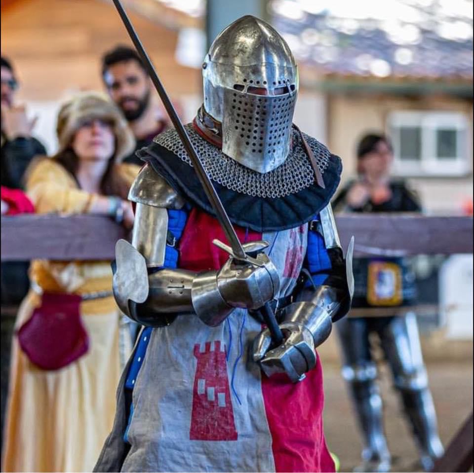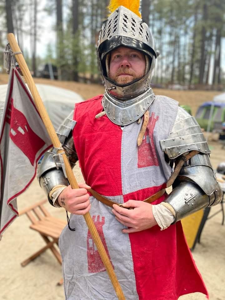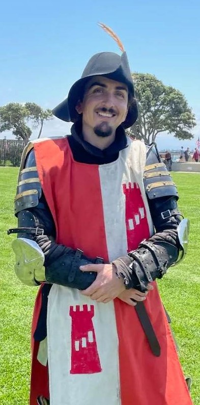 The first female Soldado, Alexandra primarily competes in melee with Den Loch, the 2023 National Women’s Melee Silver Medalists, but bears the device of St. Barbara’s Tower when she competes in Women’s Longsword, where she holds a Bronze Medal at the National level.